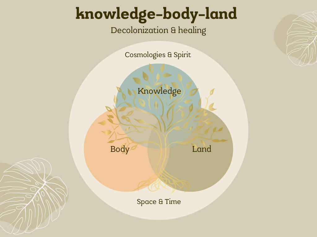 Feminist scholarship and activism informs Dr. Lavoie’s decolonizing and healing knowledge, bodies, and land framework. Feminist political ecology (FPE) shares the goals of decolonial, critical race, and Indigenous scholarship that aim for social and environmental justice and dismantling systems of oppression. Drawing from decolonial scholars of color, there is a common thread of colonial violence to knowledge, bodies and land (knowledge-body-land) which Dr. Lavoie proposes as a decolonizing and healing framework. This work responds to feminist calls for solidarity and a decolonial turn in our research and practice. The framing helps bridge epistemologies, scholars, and disciplines in resistance to the ongoing colonial, racialized, and gendered violences that shape the politics of human-environment relations and our disciplines. The diagram below is intended to depict the inseparability of knowledge-body-land, and cosmologies and spirit, and space and time, which necessitates healing because of colonial harm and disruption.